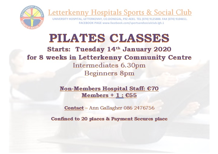 PILATES CLASSES Starts: Tuesday 14th January 2020 for 8 weeks in Letterkenny Community Centre Intermediates 6.30pm Beginners 8pm Non-Members Hospital Staff: €70 Members + 1 : €55 Contact – Ann Gallagher 086 2476756 Confined to 20 places & Payment Secures place