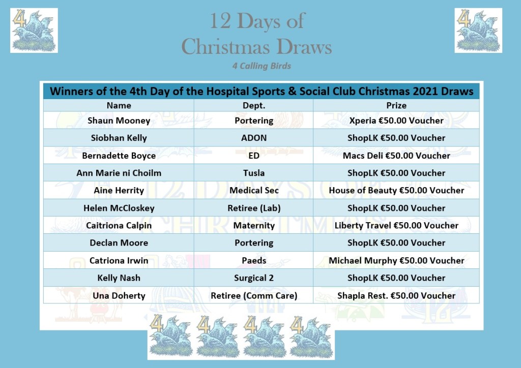Today’s prizes can be collected from – Margaret Martin in Pharmacy on 086 603 1779 or margaret.martin4@hse.ie