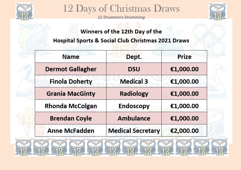 Today’s prizes can be collected from – John Gallagher @ 074 91 23506 or john1.gallagher@hse.ie