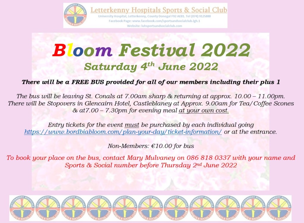 For all of our gardening enthusiasts we are offering a free bus to the bloom festival in Dublin on Saturday 4th June. Please note that entry tickets to this event must be booked by yourself in advance @ https://www.bordbiabloom.com/plan…/ticket-information/ See poster attached for booking details