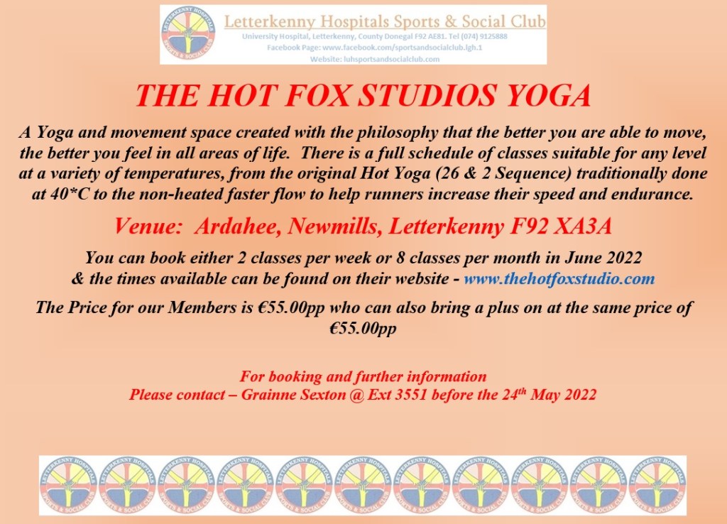 THE HOT FOX STUDIOS YOGA Posted byJohn GallagherMay 11, 2022May 13, 2022Posted inUncategorized For booking and further informationPlease contact – Grainne Sexton @ Ext 3551 before the 24th May 2022 Share this: Click to share on X (Opens in new window) X Click to share on Facebook (Opens in new window) Facebook Like Loading...