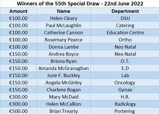 Just to let everyone know that the winners are not to collect the cheques, but to contact Bernie McGinty either by email on bernie.mcginty@hse.ie or by phone on ext. 3508 and let her know where to post the cheques to.