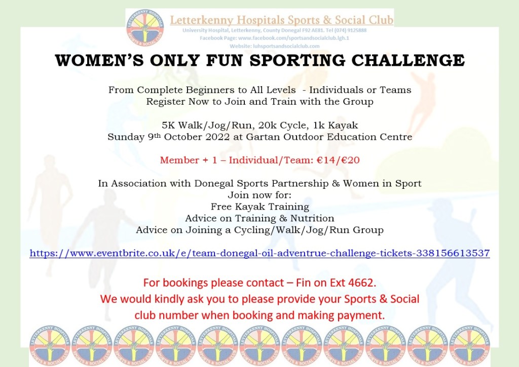 WOMEN’S ONLY FUN SPORTING CHALLENGE Posted byJohn GallagherJuly 8, 2022Posted inUncategorized For bookings please contact – Fin on Ext 4662.We would kindly ask you to please provide your Sports & Socialclub number when booking and making payment. Share this: Click to share on X (Opens in new window) X Click to share on Facebook (Opens in new window) Facebook Like Loading...