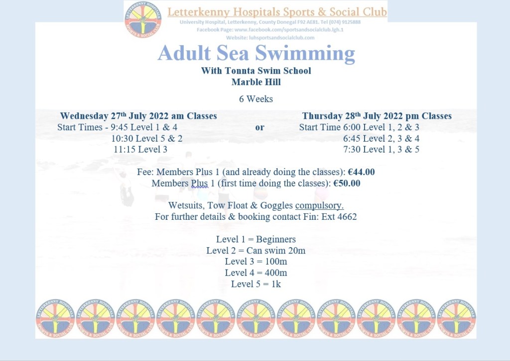 Adult Sea Swimming Posted byJohn GallagherJuly 17, 2022Posted inUncategorized For further details & booking contact Fin: Ext 4662 Share this: Click to share on X (Opens in new window) X Click to share on Facebook (Opens in new window) Facebook Like Loading...