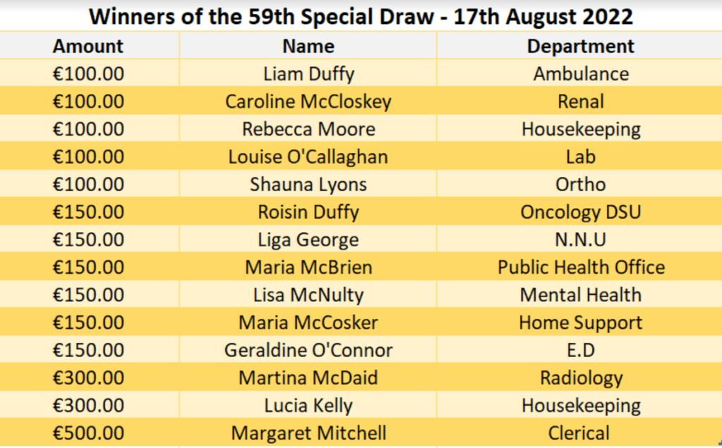 Just to let everyone know that the winners are not to collect the cheques, but to contact Bernie McGinty either by email on bernie.mcginty@hse.ie or by phone on ext 3508 and let her know where to post the cheque to.
