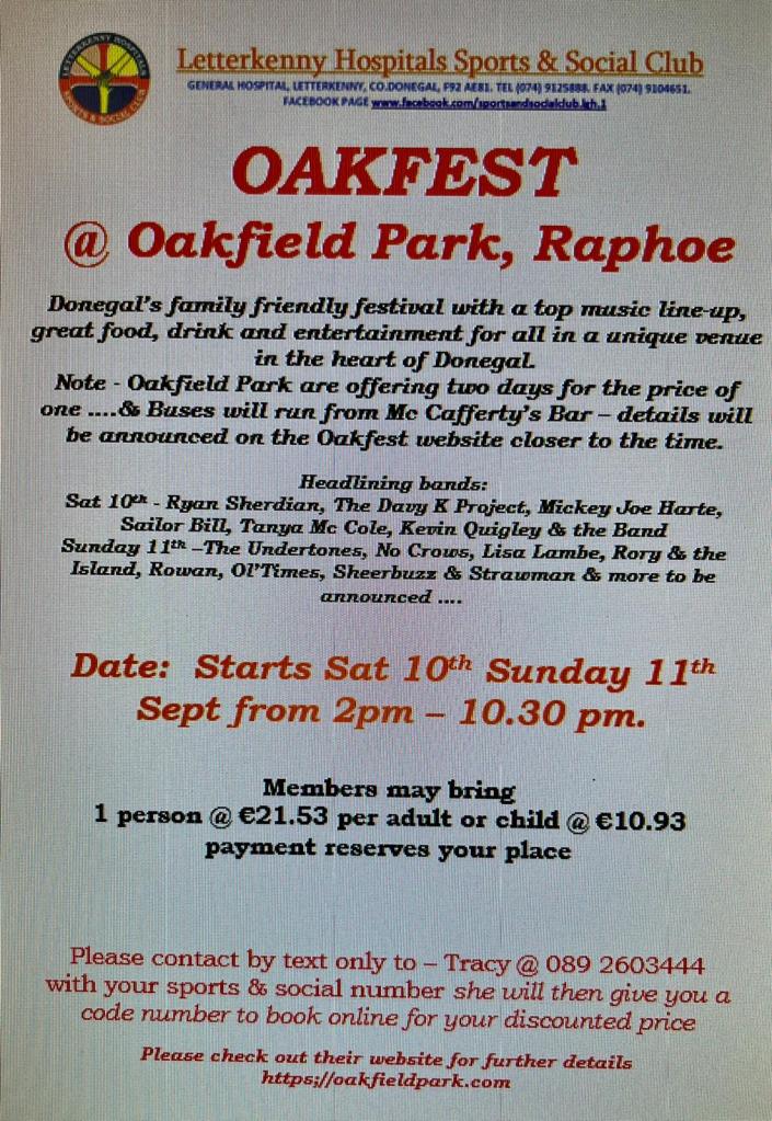 Please see information attached for the Oakfield Park, Raphoe, Co Donegal. Contact Tracy at the number provided quoting your membership number and she will provide you with a code to book your tickets online, tickets are costing €20 for adults + €1.53 booking fee & €10.00 for children + 93 cents booking fee. Please book early to avoid disappointment.