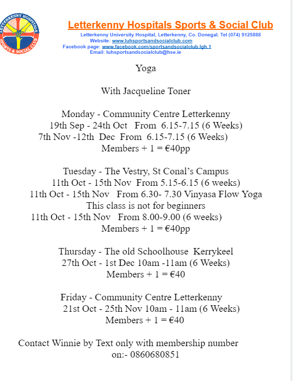 Just to let members know, we have only 2 places left for 5.15 yoga class starting on 11th October. Still a few places left for the yoga classes starting next Monday the 19th September at 6.15 -7.15pm in the community centre. Contact Winnie by text only on 0860680851