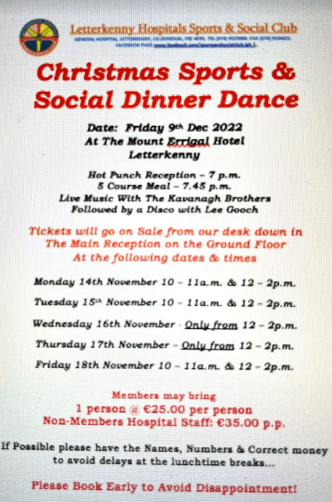 Tickets for the Sports & Social Club Dinner Dance go on Sale from our Desk in the Main Reception at the front door from Monday 14th. See times on poster attached. However, note we will NOT be selling on the morning between 10am and 11am on Wed 16th & Thur. 17th.