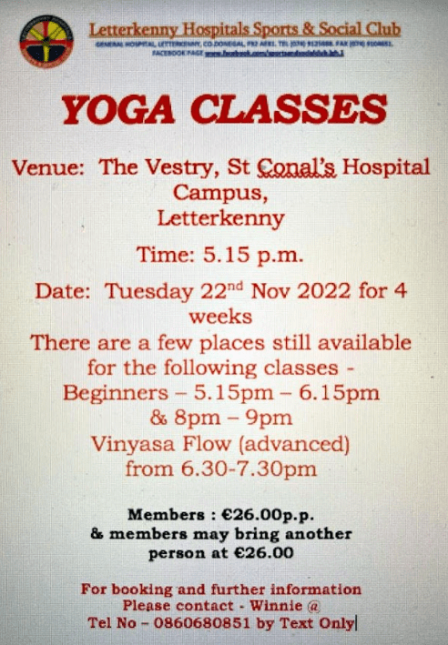 The Yoga Class from 5.15pm to 6.15pm is now full. Still some places available for the remainder. Yoga Classes: – Starting 22nd Nov for 4 weeks. All details on poster attached. Posted by0860801074mNovember 9, 2022November 14, 2022Posted inUncategorized Share this: Click to share on X (Opens in new window) X Click to share on Facebook (Opens in new window) Facebook Like Loading...