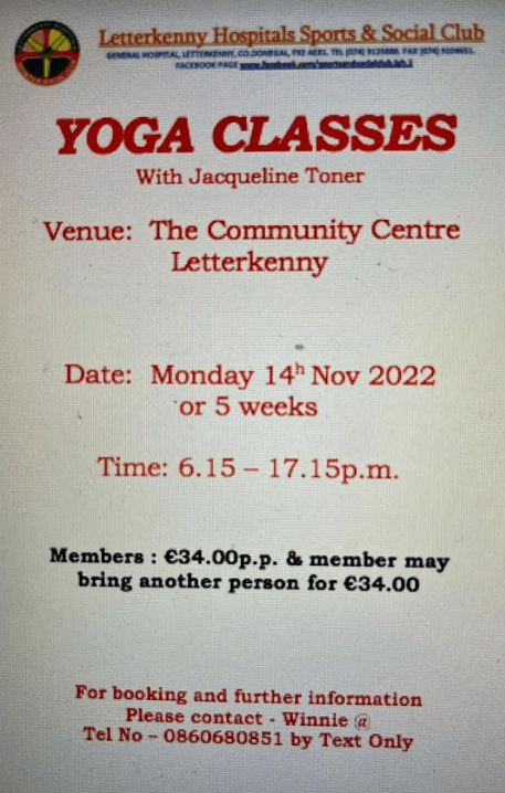 Yoga Classes: – Starting on Monday 14th for 5 weeks. All details on poster attached. Posted by0860801074mNovember 9, 2022Posted inUncategorized Share this: Click to share on X (Opens in new window) X Click to share on Facebook (Opens in new window) Facebook Like Loading...