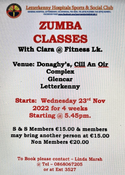 Zumba classes: – see poster for details Posted by0860801074mNovember 9, 2022Posted inUncategorized Share this: Click to share on X (Opens in new window) X Click to share on Facebook (Opens in new window) Facebook Like Loading...