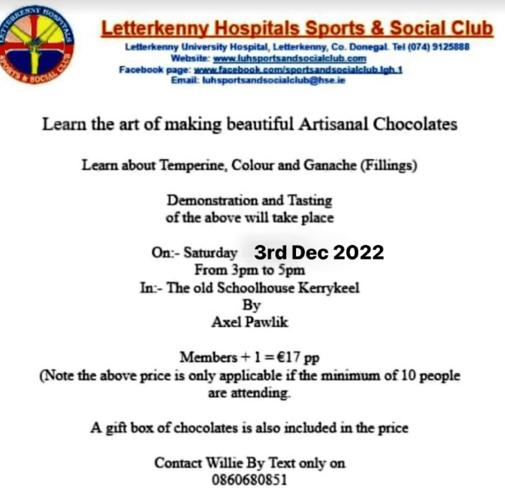 We have another opportunity to host a Class to make the beautiful Artisan Chocolates on Sat 3rd Dec 2022. Please see poster attached for further information & booking details. Text only to Winnie at the number provided Posted by0860801074mNovember 24, 2022Posted inUncategorized Share this: Click to share on X (Opens in new window) X Click to share on Facebook (Opens in new window) Facebook Like Loading...