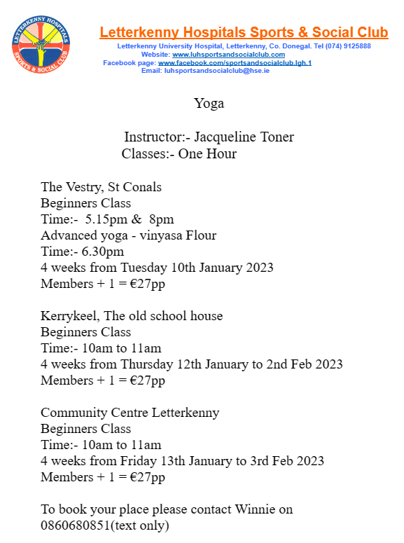 Yoga – updated poster, community centre added. See poster for details Posted by0860801074mJanuary 5, 2023Posted inUncategorized Share this: Click to share on X (Opens in new window) X Click to share on Facebook (Opens in new window) Facebook Like Loading...