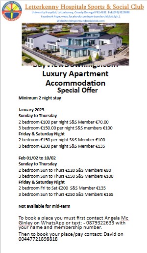 We have some exciting deals for our members shown below in the poster attached at the Luxury Apartments @ Bayview, Downings, Co. Donegal. To book you must firstly contact Angela at the number shown with your name & social club number & then contact David to book and pay.