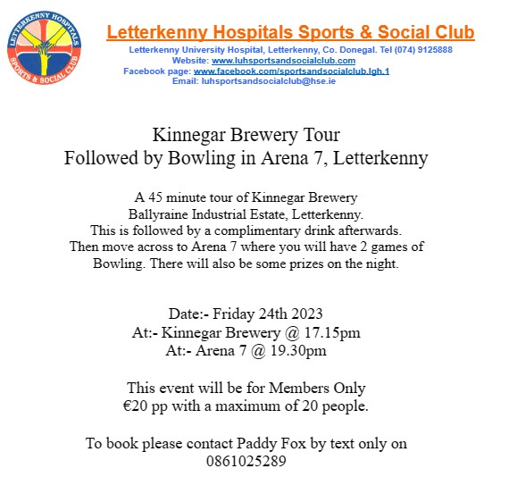 A fun night out at our Local Kinnegar Brewery followed by Bowling at Arena 7. For members only and booking details shown on the poster. Posted by0860801074mFebruary 3, 2023Posted inUncategorized Share this: Click to share on X (Opens in new window) X Click to share on Facebook (Opens in new window) Facebook Like Loading...