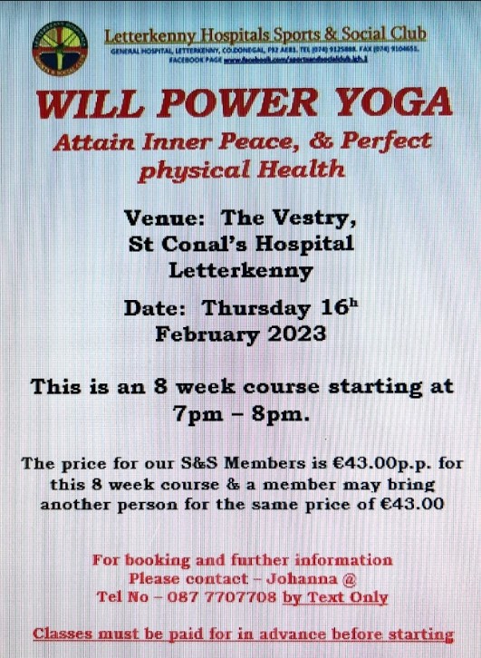 Will Power Yoga, Mindfulness & Relaxation will be starting up for our members on Thursday 16th February from 7pm to 8pm in the Vestry, St Conal’s. See poster attached for further details and information to book. Posted by0860801074mFebruary 10, 2023Posted inUncategorized Share this: Click to share on X (Opens in new window) X Click to share on Facebook (Opens in new window) Facebook Like Loading...