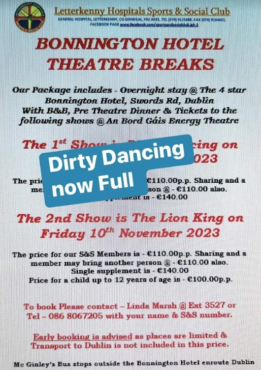 The first show for Dirty Dancing is now full. If still interested attending The Lion King, please contact Linda at the number on the poster attached as places are filling up fast. Posted by0860801074mMarch 1, 2023Posted inUncategorized Share this: Click to share on X (Opens in new window) X Click to share on Facebook (Opens in new window) Facebook Like Loading...