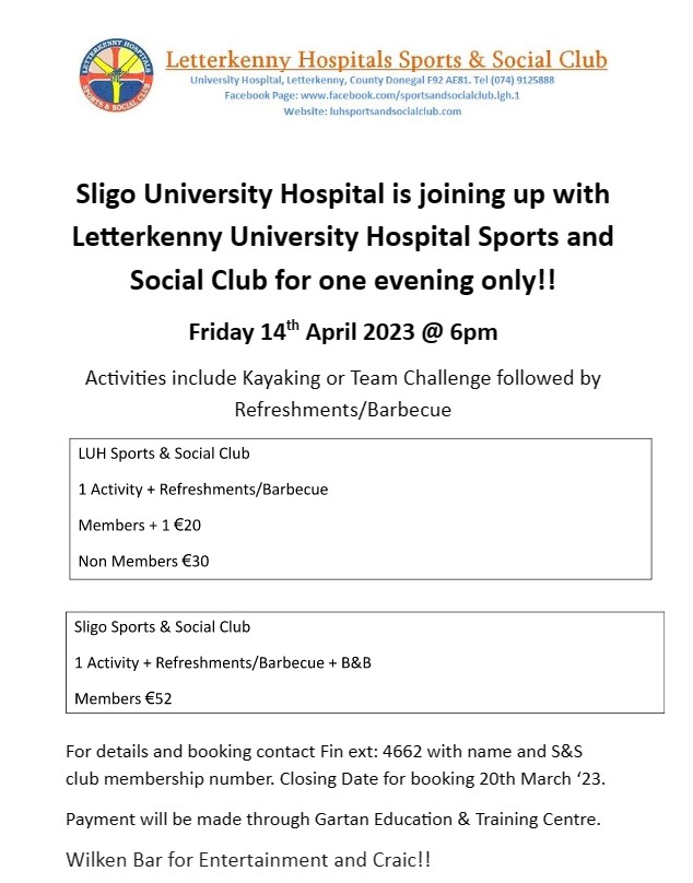 For one evening only we are joining up with Sligo University Hospital on Friday 14th April for Kayaking or Team challenge followed by refreshments/BBQ. Please see poster attached for further information & booking details. Posted by0860801074mMarch 5, 2023Posted inUncategorized Share this: Click to share on X (Opens in new window) X Click to share on Facebook (Opens in new window) Facebook Like Loading...