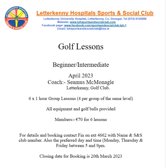 We have Golf Lessons available for beginners & intermediate players, starting April 2023. Please see poster attached for further information & booking details. Posted by0860801074mMarch 5, 2023Posted inUncategorized Share this: Click to share on X (Opens in new window) X Click to share on Facebook (Opens in new window) Facebook Like Loading...