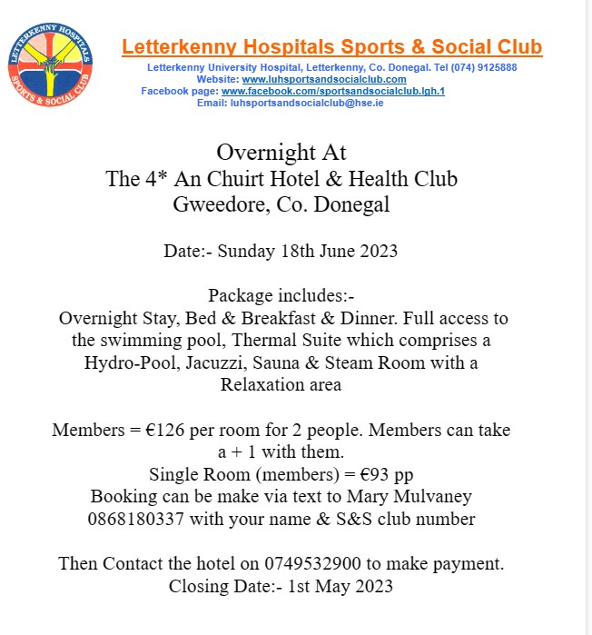Apologies – Error on poster advertised. Please see poster attached for the Overnight stay at An Chuirt Hotel & Health Club. For further information and booking contact Mary. Details on poster. Posted by0860801074mMarch 6, 2023Posted inUncategorized Share this: Click to share on X (Opens in new window) X Click to share on Facebook (Opens in new window) Facebook Like Loading...