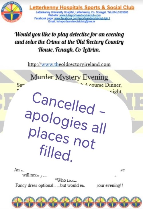 Apologies Our Murder Mystery Evening is Cancelled, unable to fill the places. Posted by0860801074mMarch 6, 2023Posted inUncategorized Share this: Click to share on X (Opens in new window) X Click to share on Facebook (Opens in new window) Facebook Like Loading...