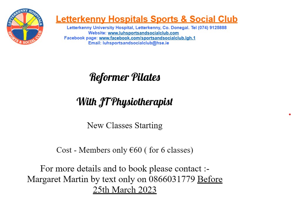 Reformer Pilates restarting. Please see poster attached for further information & booking details. Posted by0860801074mMarch 14, 2023Posted inUncategorized Share this: Click to share on X (Opens in new window) X Click to share on Facebook (Opens in new window) Facebook Like Loading...