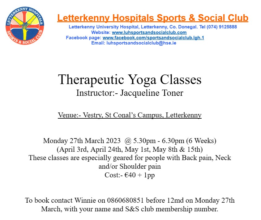 We have Therapeutic Yoga classes starting in the Vestry@ St Conal’s Campus. Please see poster attached for further information & contact Winnie with your name & S&S club number before 12 md on Monday 27th March to book your place. Posted by0860801074mMarch 23, 2023Posted inUncategorized Share this: Click to share on X (Opens in new window) X Click to share on Facebook (Opens in new window) Facebook Like Loading...