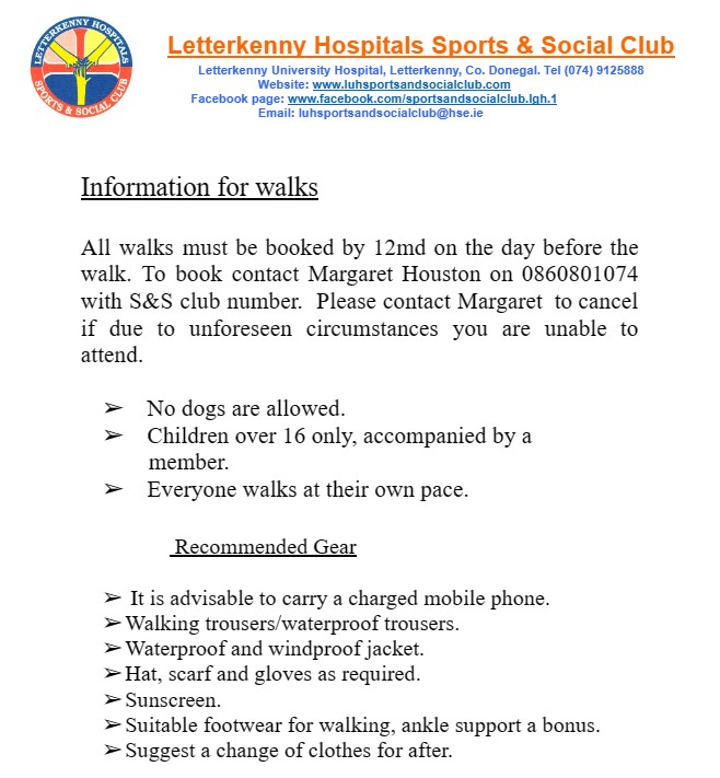 “Walking back to happiness” Yes our walks are starting back again on Thursday 13th April 2023. Why not join us, its a lovely way of seeing our beautiful county. Just think, your fitness level will be increased and at the same time you can enjoy meeting some lovely people. See list of walks attached and information on same. All walks must be booked with Margaret Houston on 0860801074.
