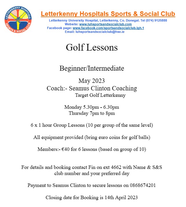 Golf Lessons – Last chance to book remaining places for Golf Lessons with Coach Seamus Clinton at Target Golf Letterkenny. See poster for further details and on how to book your place. Posted by0860801074mApril 13, 2023Posted inUncategorized Share this: Click to share on X (Opens in new window) X Click to share on Facebook (Opens in new window) Facebook Like Loading...