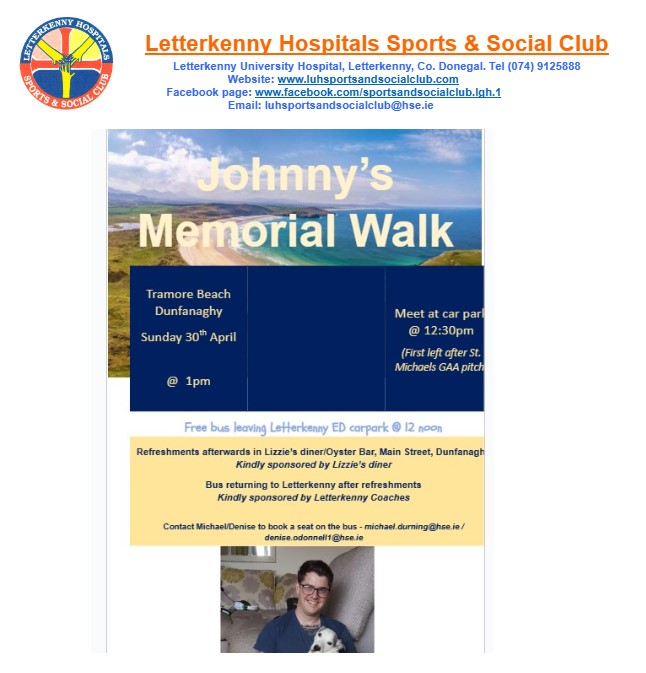 Johnny’s Memorial Walk is taking place on Sunday 30th April. A free bus will leave Letterkenny ED car park @ 12noon arriving at the car park in Dunfanaghy at 12.30pm. The car park is first left after St Michaels GAA pitch if people are travelling there themselves. See attached poster for further information and details on how to book your place on the bus.