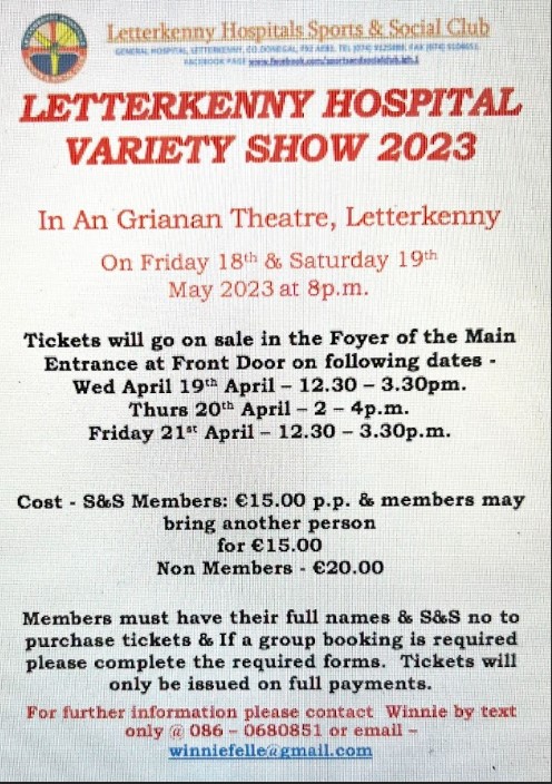 Have you got your ticket for the Letterkenny Hospital Variety Show?Tickets are for sale on Wednesday 3rd & Thursday 4th May from 12md to 2.30pm outside the Canteen. Contact Winnie Felle 0860680851 by test only to book your ticket. Poster attached for further information.