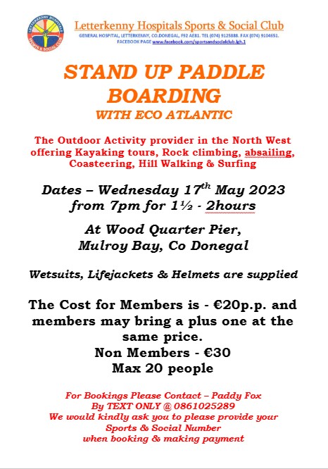 We will be having another evening doing our popular Stand Up Paddle Boarding with Eco Atlantic Adventures. Please see poster regarding further information & booking details. Posted by0860801074mMay 4, 2023Posted inUncategorized Share this: Click to share on X (Opens in new window) X Click to share on Facebook (Opens in new window) Facebook Like Loading...