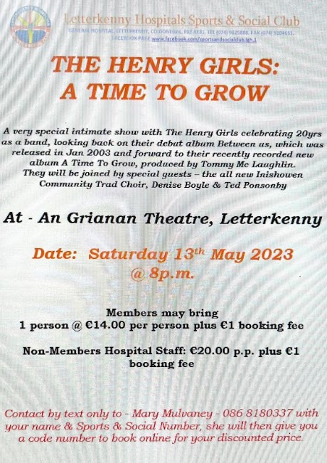 We have tickets for the Henry Girls in An Grianan Theatre, on Saturday 13th May. Please see poster attached for further information & booking details Mary Mulvaney. Posted by0860801074mMay 8, 2023Posted inUncategorized Share this: Share on X (Opens in new window) X Share on Facebook (Opens in new window) Facebook Like Loading...