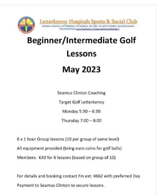We still have some spaces left for our Beginner & Intermediate Golf Lessons this Thursday 11th May 2023. These classes have become very popular with our members and provide you with all of the skills to hit the green this Summer. Please see poster attached for further information & booking details with Fin Begley.