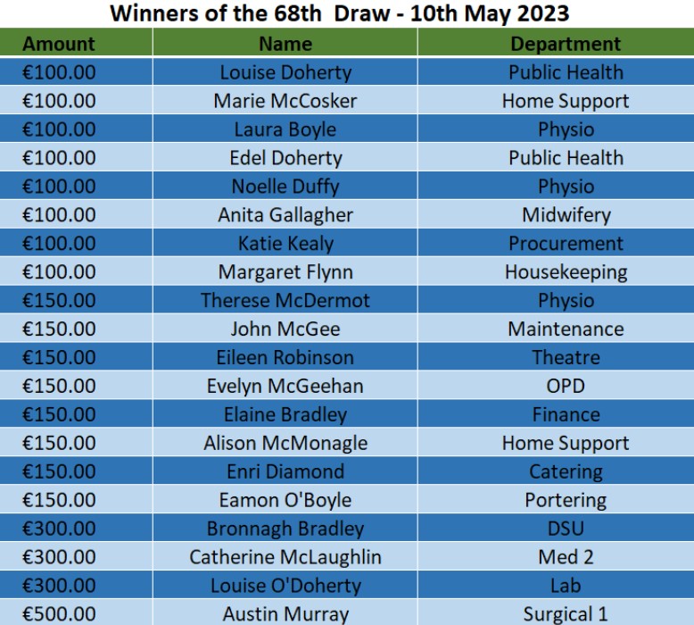 Congratulations to all of the winners of our draw for May 2023. Just to let everyone know that the winners may contact Bernie McGinty at 3508 or bernie.mcginty@hse.ie to collect their cheques. Posted by0860801074mMay 11, 2023Posted inUncategorized Share this: Click to share on X (Opens in new window) X Click to share on Facebook (Opens in new window) Facebook Like Loading...