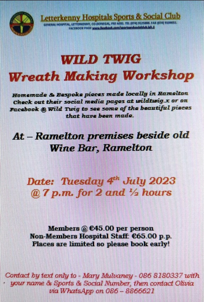 We have a workshop on Wreath Making with Wild Twig Ramelton. Please see poster attached for further information & booking details. Posted by0860801074mMay 15, 2023Posted inUncategorized Share this: Click to share on X (Opens in new window) X Click to share on Facebook (Opens in new window) Facebook Like Loading...