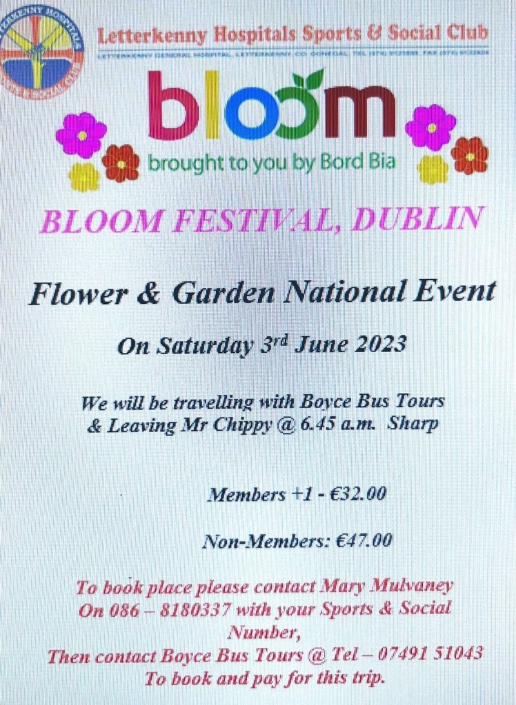 We will be travelling to Bloom this year with Boyce Bus Tours on Saturday 3rd June in the Phoenix Park Dublin. Please see poster attached for further information & booking details. Posted by0860801074mMay 15, 2023Posted inUncategorized Share this: Click to share on X (Opens in new window) X Click to share on Facebook (Opens in new window) Facebook Like Loading...