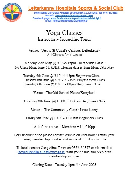 Note change of dates for Yoga Classes with Instructor Jacqueline Toner. See poster for further information and details. Posted by0860801074mMay 24, 2023Posted inUncategorized Share this: Click to share on X (Opens in new window) X Click to share on Facebook (Opens in new window) Facebook Like Loading...