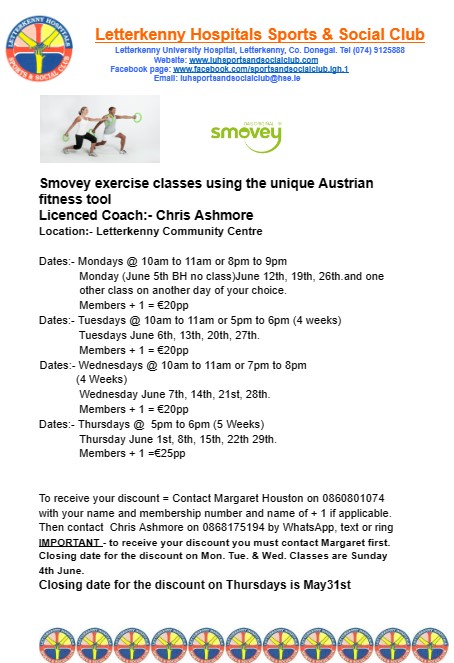 We have our next course of SMOVEY exercise classes commencing in June. See poster for further information and details. Posted by0860801074mJune 1, 2023Posted inUncategorized Share this: Click to share on X (Opens in new window) X Click to share on Facebook (Opens in new window) Facebook Like Loading...