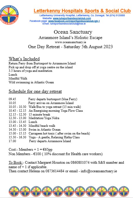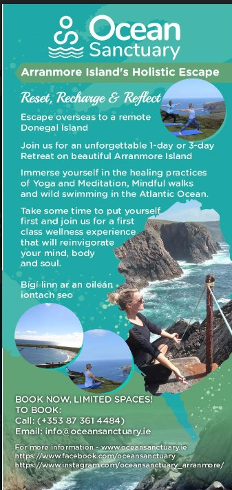 Sorry wrong poster posted on last email. See new poster . We have a lovely one day Yoga Retreat in Arranmore Island on Saturday 5th August 2023. See posters for more information and details. To receive your discount contact Margaret Houston on 0860801074.
