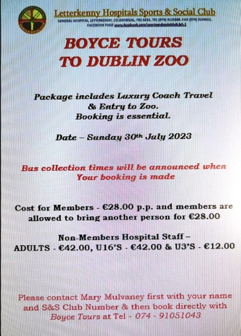 We have a wonderful trip with Boyce’s Tours to Dublin Zoo. Please see the poster attached for all of the information & booking details. Please book early to avoid disappointment. Posted by0860801074mJune 22, 2023Posted inUncategorized Share this: Click to share on X (Opens in new window) X Click to share on Facebook (Opens in new window) Facebook Like Loading...