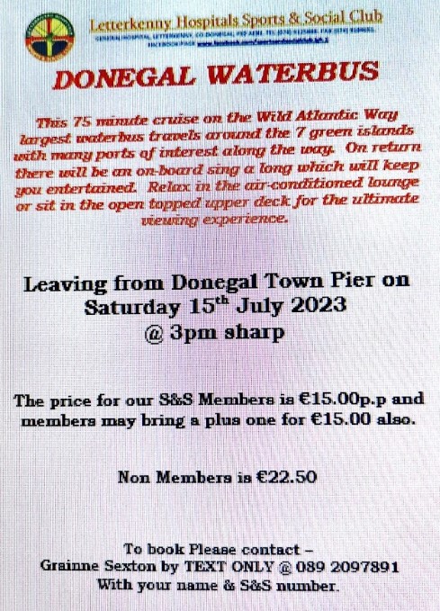 We have tickets for the lovely trip on the Donegal Waterbus departing from Donegal Town Pier on Sat 15th July 2023. See poster attached for further information & booking details. Limited places so book early to avoid disappointment. Posted by0860801074mJune 22, 2023Posted inUncategorized Share this: Click to share on X (Opens in new window) X Click to share on Facebook (Opens in new window) Facebook Like Loading...