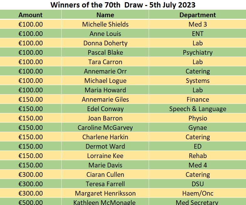 Congratulations to all of the winners of our draw for July 2023. Just to let everyone know that the winners may contact Bernie McGinty at ext -3508 or bernie.mcginty@hse.ie to collect their cheque. Posted by0860801074mJuly 6, 2023Posted inUncategorized Share this: Click to share on X (Opens in new window) X Click to share on Facebook (Opens in new window) Facebook Like Loading...