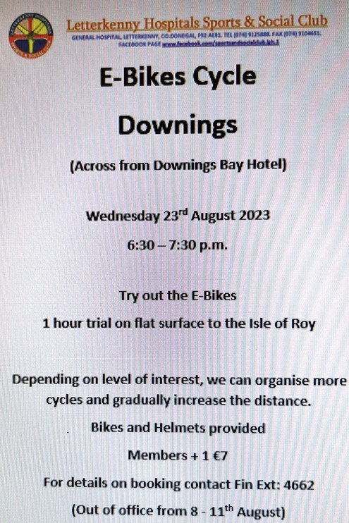 For any of our E-Bike enthusiasts we have an E-Bike Trail taking place on Wed 23rd August from 6.30pm to 7.30pm. Bikes and helmets are provided. See the poster attached for further information & booking details. Posted by0860801074mAugust 4, 2023Posted inUncategorized Share this: Click to share on X (Opens in new window) X Click to share on Facebook (Opens in new window) Facebook Like Loading...