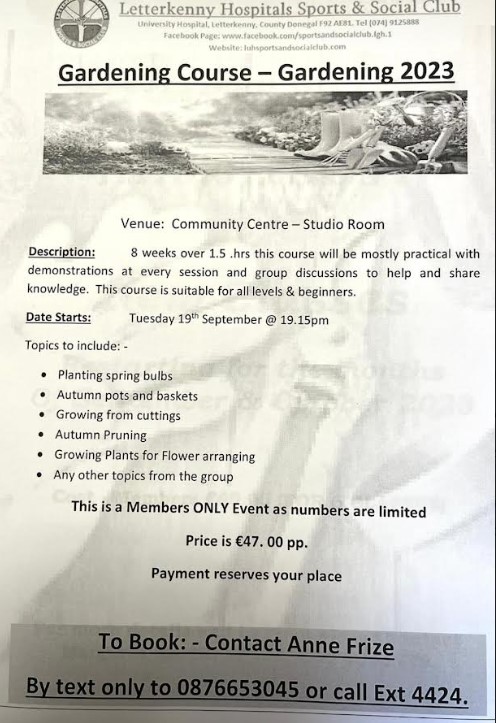 We have 3 new courses starting in September. Gardening course starting Tuesday 19th September. Art classes starting Monday 18th September. Thai Chi on Wednesday 27th of September. All of these events are Members Only as our spaces are limited. So please book early with Anne Frize at the number given below to avoid disappointment.