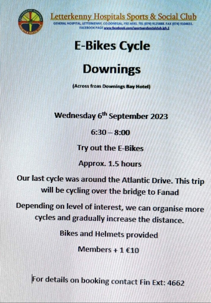 After our very successful E-Bikes cycle in Downing’s Last week we have decided to run another evening, this time across the bridge to Fanad. Please see poster attached for further information & booking detail. Posted by0860801074mSeptember 2, 2023Posted inUncategorized Share this: Click to share on X (Opens in new window) X Click to share on Facebook (Opens in new window) Facebook Like Loading...