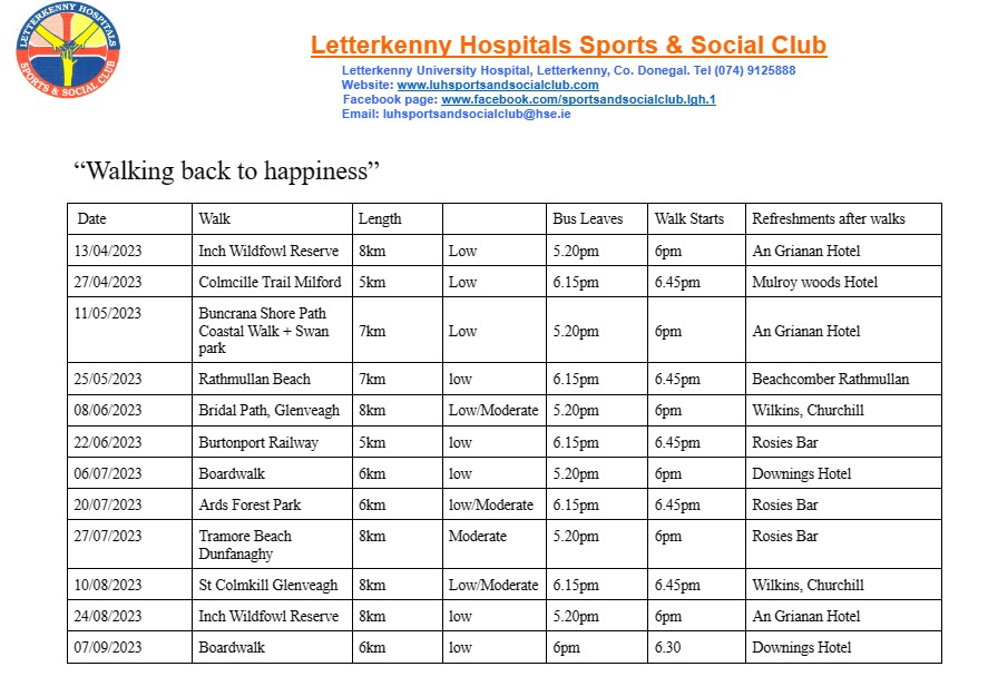 Still some spaces left for the walk tomorrow evening. Bus leaving St Conal’s at 6pm for the Boardwalk. Enjoy a beautiful evenings walk alone one of Donegal most picturesque beaches. To book your place please contact Margaret Houston on 0860801074 with your name and S&S club membership number, also name of + 1 if applicable. Members + 1 are free.