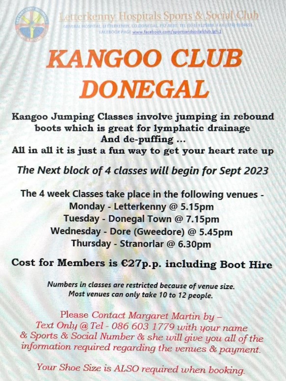 We have our popular & energetic Kangoo Classes re-starting. Please see poster attached for further information & booking details. Posted by0860801074mSeptember 6, 2023Posted inUncategorized Share this: Click to share on X (Opens in new window) X Click to share on Facebook (Opens in new window) Facebook Like Loading...