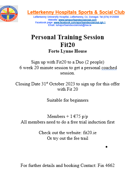 We have Personal Training Sessions available with Fit20. Please see poster attached with further information & booking details. The closing date is 31st October so book early to avoid disappointment. Posted by0860801074mOctober 23, 2023Posted inUncategorized Share this: Click to share on X (Opens in new window) X Click to share on Facebook (Opens in new window) Facebook Like Loading...