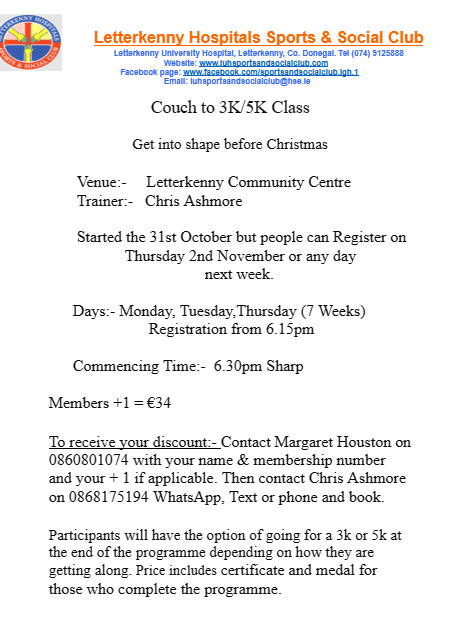 For anyone wishing to get fit before Christmas, we have the Couch to 3K/5k starting from the Community Centre, Letterkenny. If you wish to register, out members must 1st contact Margaret at the details given below to receive their Discount. Please see poster attached with further information & booking details.